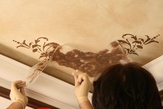 Краска наносится с помощью кисти, губки или валика. Важно, при работе с трафаретом, краски должно быть минимальное количество, чтобы исключить возможность подтекания.