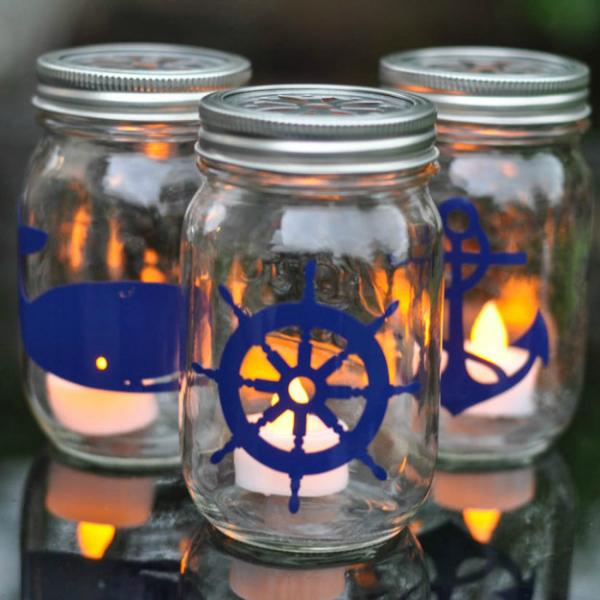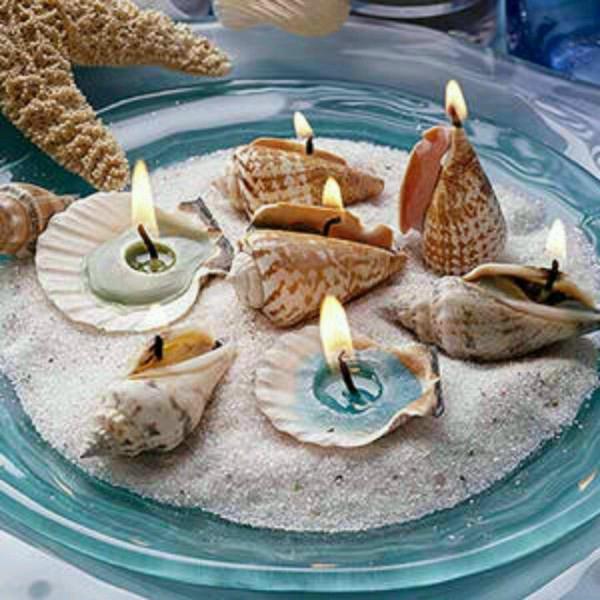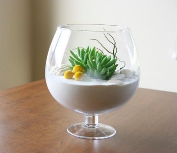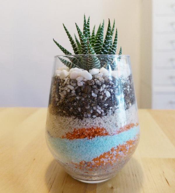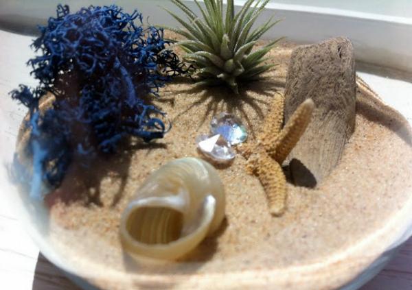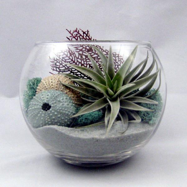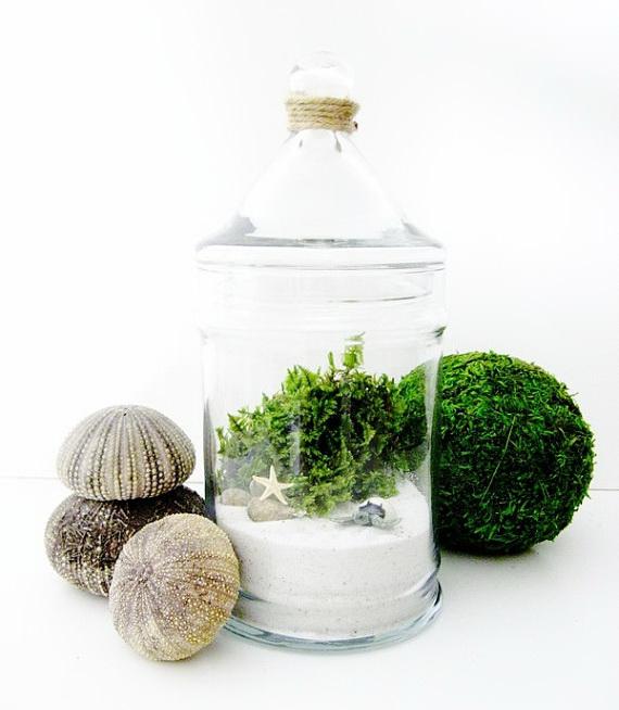 Наверняка у вас дома хранятся ракушки и камешки, привезенные из отпуска? Теперь им есть применение - сделайте свой мини-пляж в стеклянной банке. Насыпьте песок и добавьте украшений: морскую звезду, обточенные морем стеклышки, причудливые раковины. Яркий цвет добавят сухие веточки или миниатюрные суккуленты.