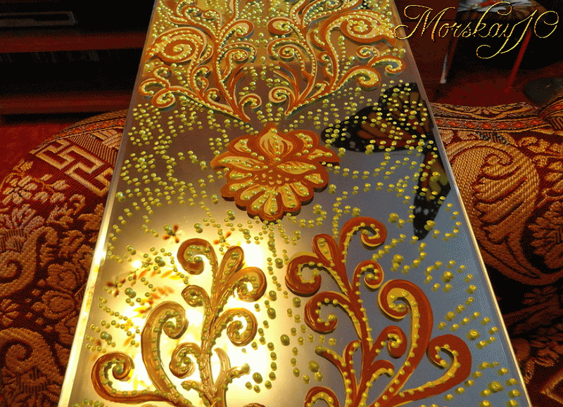 Неделю походили, полюбовались, а потом я решила сделать эти зеркальные вставки более красивыми! Расписала за два дня, тем, что было под рукой! А под рукой оказались половая краска и эмаль желтого цвета.