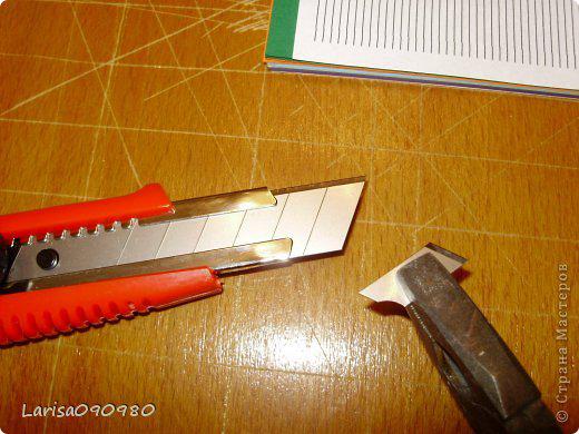 Я уже говорила, что такие лезвия разделены на секции. Когда почувствуете, что лезвие затупилось (я нарезала около 15 кучек по 35 полосок), осторожно отломайте крайнюю секцию (держа её плоскогубцами). Нож опять очень острый. Так можно ломать до конца всего лезвия
