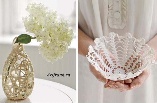 В конце добавить столовую ложку водки или спирта, профильтровать раствор через сито или марлю и обработать вещь, как желатином.(я просто окунаю изделие в раствор и затем высушиваю на нужной мне форме, или растягиваю на ровной поверхности до полного высыхания)