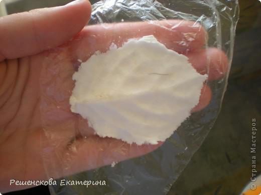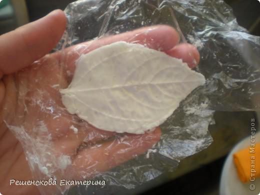 Раскатываем небольшой кусочек силиконовой массы по величине листа и прижимаем лист сверху.