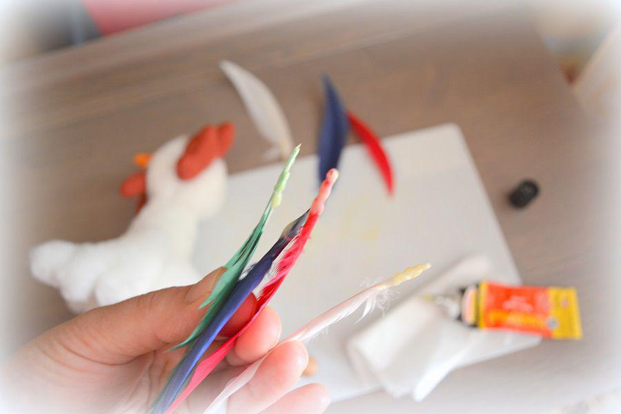 Тонируем игрушку, я затонировала совсем чуть-чуть около глазок. Коричневой краской подкрашиваем клювик, делаем петушку "педикюр" — подкрашиваем коготки, покрываем лаком.
