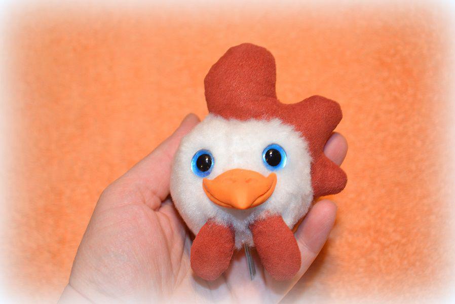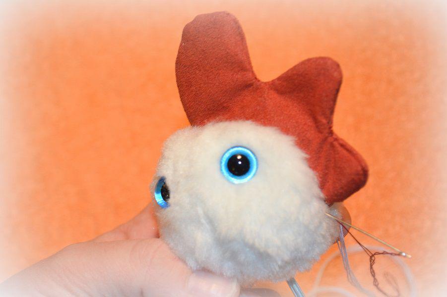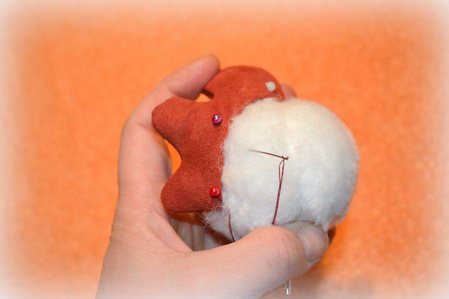 А тем временем пришиваем нашему петушку гребешок. Я пришиваю сначала переднюю часть: