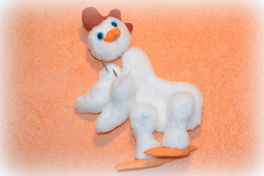 Одно на шее (это для удобства крепления головы и крыльев), второе — сзади, для крепления ног и набивки.