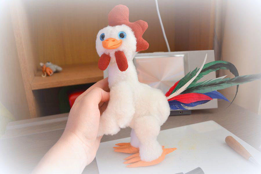 Петушок выполнен по технологии тедди, то есть имеет шплинтовое крепление конечностей. При желании, можно использовать и пуговичное (нитяное) крепление — это как кому больше нравится:) Время изготовления указано условное — я работала над игрушкой несколько дней по 1-2 часа в день.