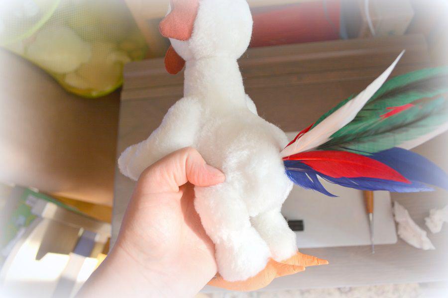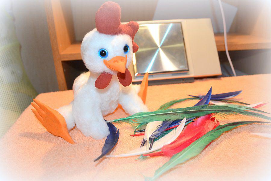 Зашиваем отверстие в задней части туловища. Итак, наш петушок почти готов. Осталась немаловажная деталь — петушиный хвост. Для хвоста я использовала декоративные перья (продаются в отделах рукоделия). Если не получилось найти такие перья, пофантазируйте, можно сделать хвост и из основного материала, наподобие крыльев. Только не переборщите с набивкой, иначе хвост будет "тянуть" петушка вниз, нарушит равновесие и петушок не сможет стоять на ножках.