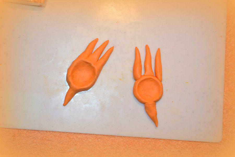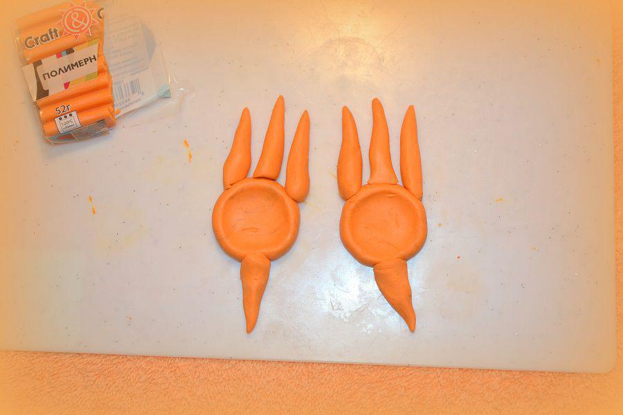 Далее стеком или каким-нибудь другим подручным инструментом (у меня все тот же маникюрный набор) нужно прилепить каждый пальчик к основанию лапки, неровности сглаживаем пальцами.