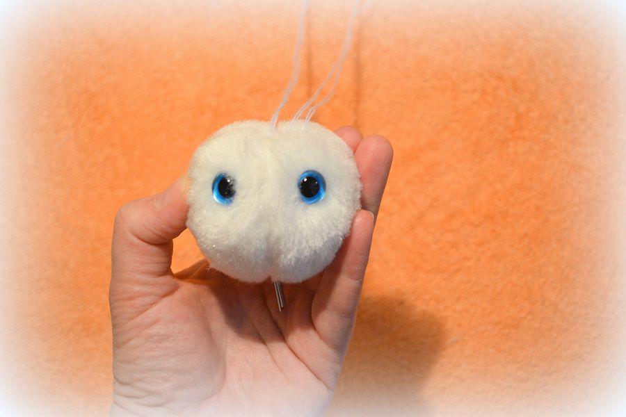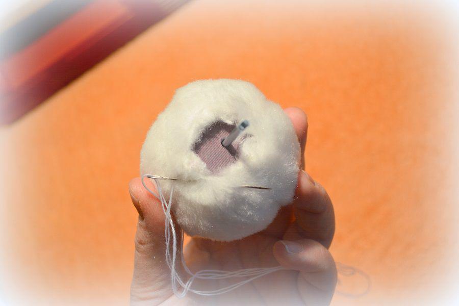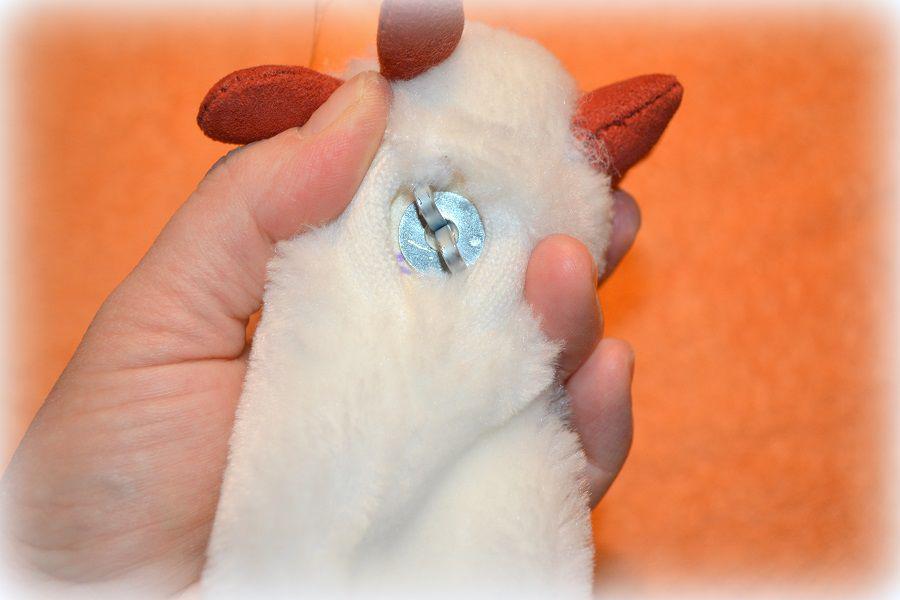 Далее набиваем холлофайбером голову игрушки. Набивка достаточно плотная. В незашитое отверстие внизу головы вставляем диск с шплинтом и шайбой.