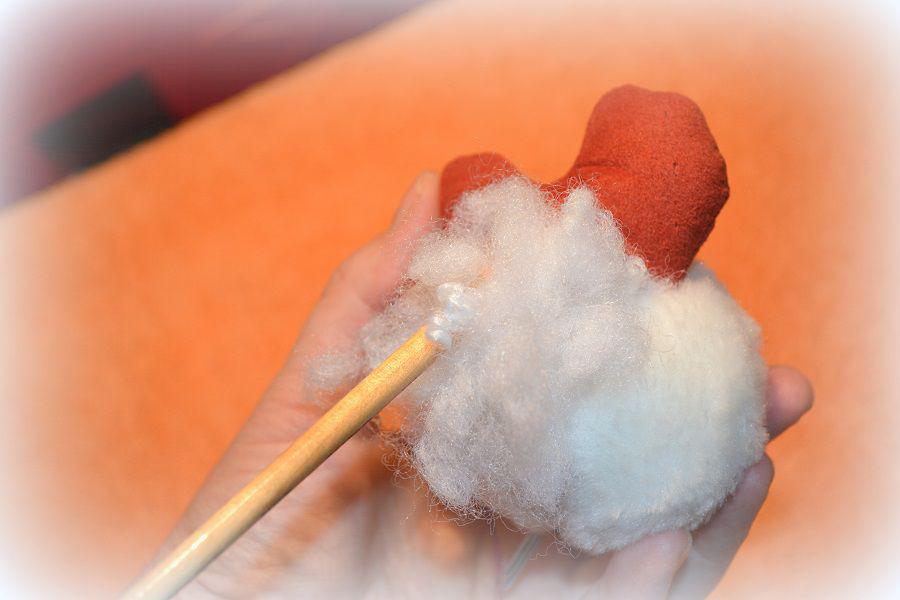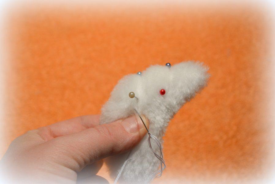Я не делала предварительной утяжки головы. В местах крепления глазок проделываю отверстия шилом. Вставляю глазки, закрепляя нити в самом центре головы, в месте расположения гребешка.