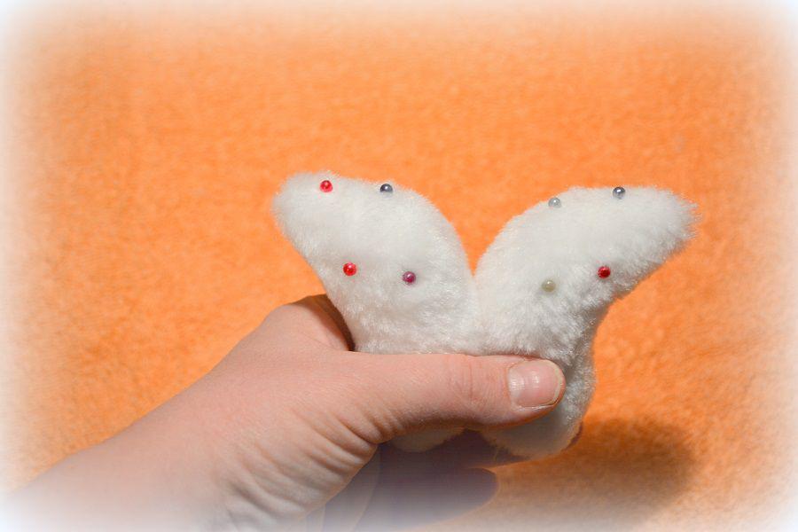 Вставляем шплинтовые крепления в крылья и ноги. Для этого в местах, обозначенных на выкройке крестиком, с помощью шила проделываем отверстия, стараясь не разорвать ткань. В полученное отверстие вставляем шплинтовое крепление: