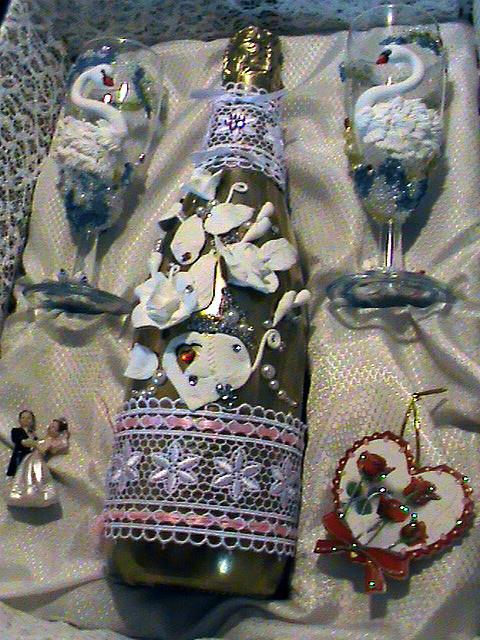 бутылка в том же стиле, только цветы .Вверху и в низу кружево.