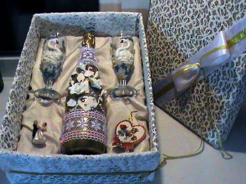 Коробка из под обуви. Поверх обклеила гофрированной бумагой и обтянула кружевной тканья, бантик из белой и золотой атласной ленты Внутри белый подкладочный шелк.
