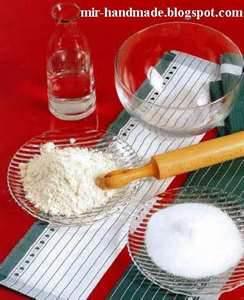 Для того чтобы наши поделки после сушки и окончательной обработки получались более прочными, добавим одну-две столовые ложки обойного клея. Если добавить картофельный крахмал, тесто станет очень нежным и пластичным. Из такого теста хорошо создавать тонкие, изысканные работы с множеством мелких деталей. Хотя, если вы хотите добавить крахмал, правильнее было бы сварить клейстер и использовать его вместо воды. Следует также помнить, что крахмал делает поделку боле хрупкой. Поэтому тут важно не переусердствовать. Для количества муки, приведенного в нашем рецепте, будет достаточно столовой ложки с горкой.