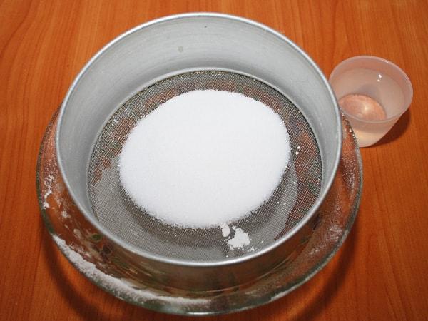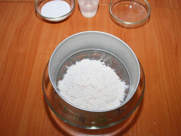 Для начала просеиваем муку, а затем повторяем то же самое с мелкой солью.