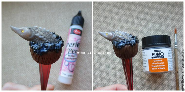 Последний этап: когда рыбка остыла, я покрываю икорку гелем (гель для создания эффекта стекла Glas Effekt Gel), который сразу мутный, но после высыхания становится прозрачным. Так наша икорка будет смотреться как настоящая! А рыбку покрываем лаком.
