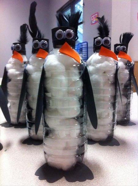 Заполните пластиковую бутылку ватными шариками, добавьте детали из бумаги, и у вас получится чудесный пингвинчик!