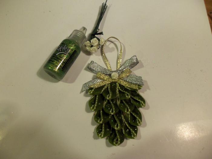 При желании можно украсить шишку блестками, искусственным снегом! При желании, можно сделать шишку двусторонней - тогда, те же операции проделайте с другой стороны!