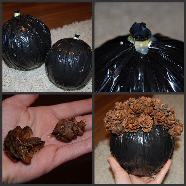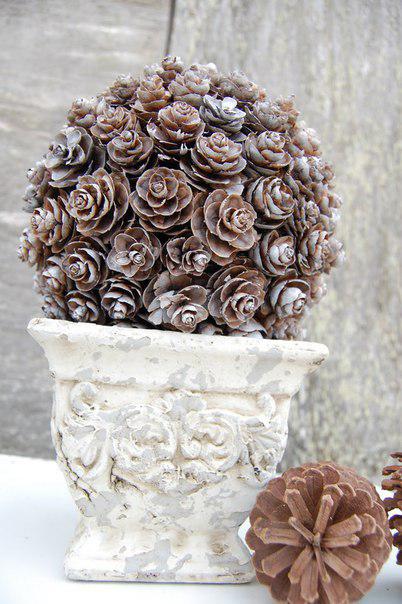 Красивую зимнюю композицию для новогоднего декора дома или дачи можно сделать с помощью обычных шишек, подкрашенных белой краской и большого шара (воздушного шарика, резинового мяча, тыквы, арбуза и т.д.)