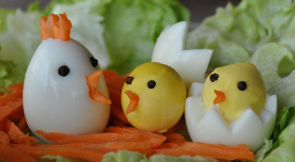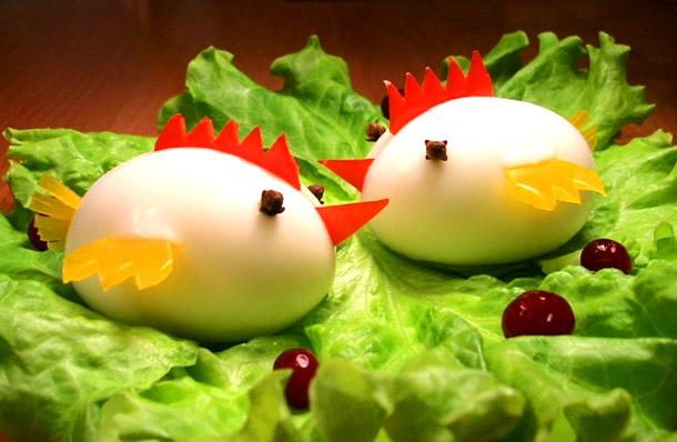 Из мелко рубленного салата, например, салат Мишки в сыре, можно сформировать шарики-цыплята, обвалять их в тертом желтке и усадить в «скорлупки» из белка. Так можно подать и фаршированные яйца с любой начинкой.