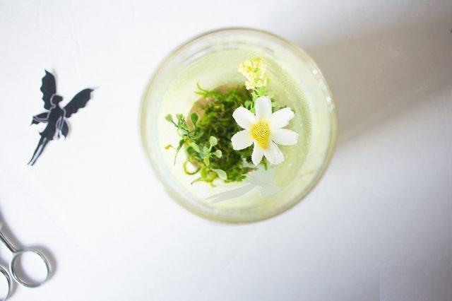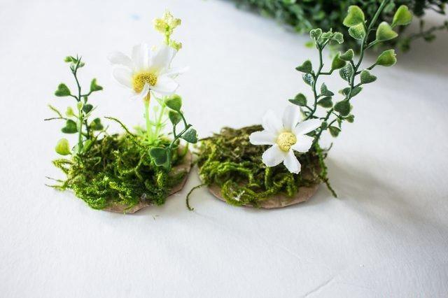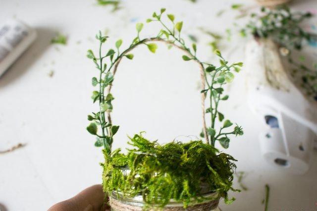 Шаг 4. Вырежьте кусок картона чуть меньшего диаметра чем дно банки, чтобы он поместился внутри банки. Приклейте на картон при помощи клеящего пистолета искусственный мох и части искусственных растений на свой вкус. Только оставьте место под свечу.