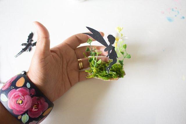 Шаг 6. Горячим клеем приклейте фею на картон так, чтобы она разместилась как можно ближе к краю картонки (чтобы не попала под пламя свечи). В принципе, силуэт можно приклеить прямо на стенку бкнеи с внутренней стороны (так будет еще проще)