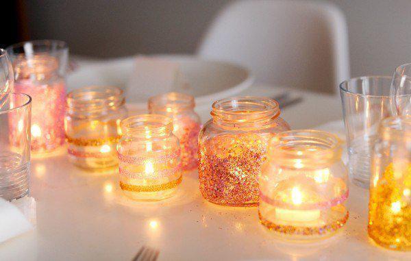 Шаг 2. Пока клей не засох, насыпьте внутрь банки глиттер.