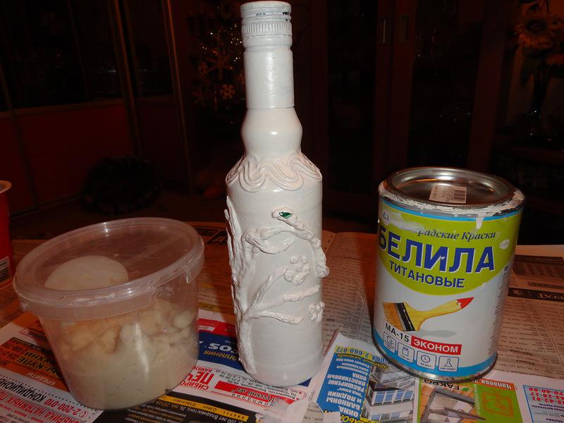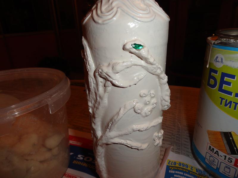 Потом из массы лепила колбаски, и сразу прилепляла на бутылку то в виде змеи, то в виде дерева-ствола и веток! Фотографировать не стала, не думала, что получится что-то путное:))