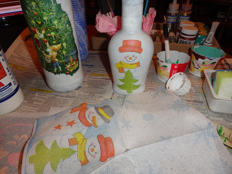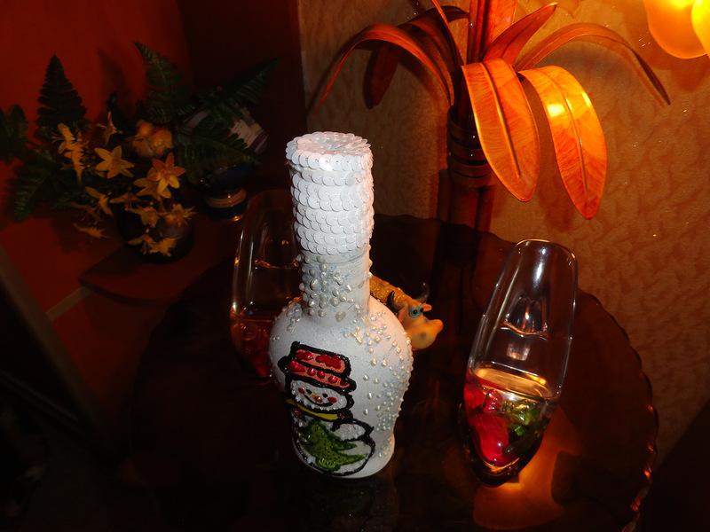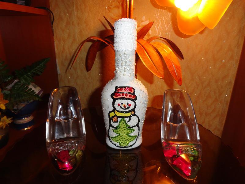 Сразу же делала и вторую бутылку, приклеила снеговиков:
