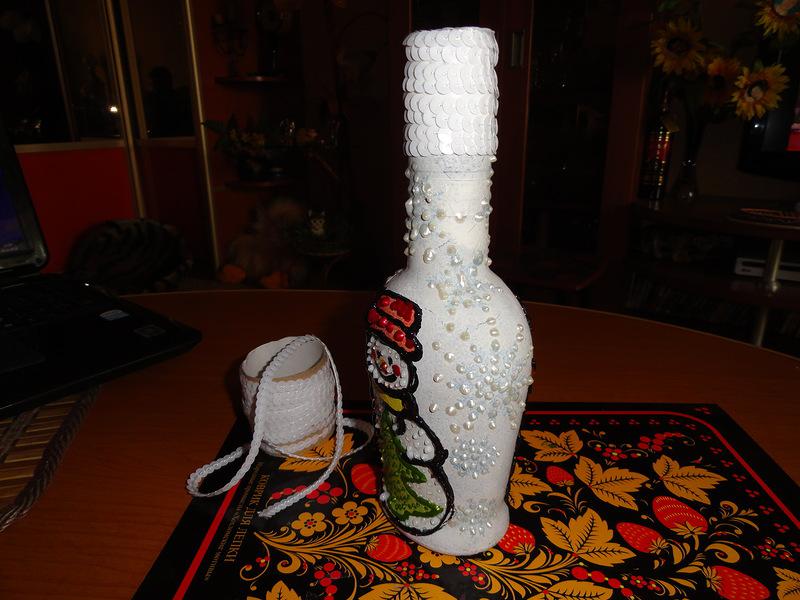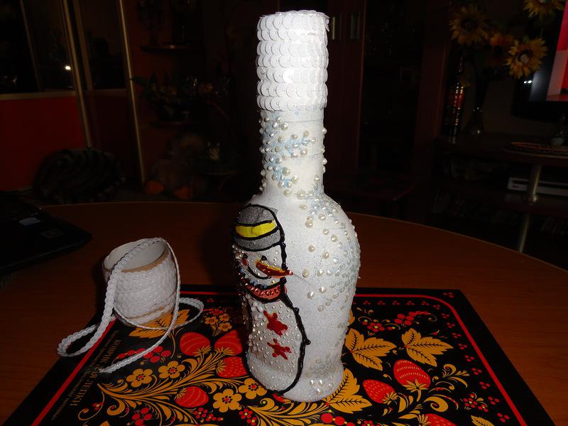 Вот тут возникла проблемка…я успела задекорировать только ОДНУ бутылку! :)) Поэтому, ловите пока лишь СНЕГОВИКА! А ёлочку — завтра!