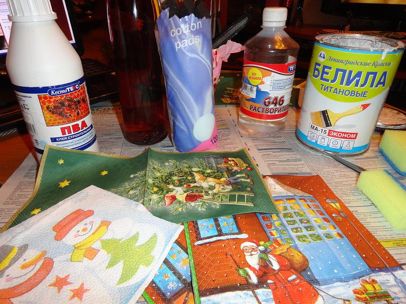 Ддля работы Вам потребуется всего лишь салфетки, клей ПВА, белая краска для тонирования , и бутылки: