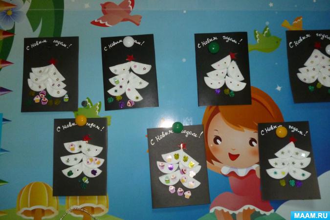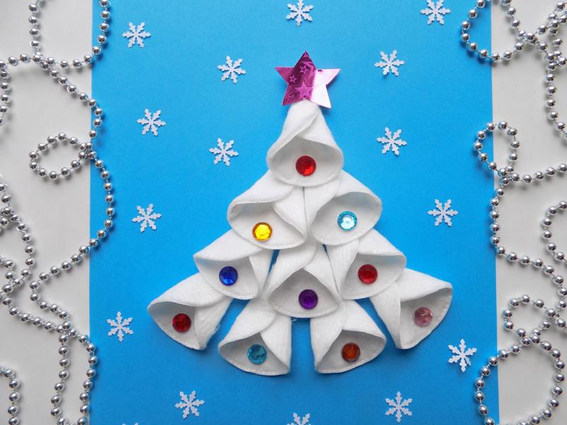А что, если в детском садике ребенку поручили сделать новогоднюю открытку? Ватные диски и тут выручат: сделайте аппликацию. Идеи — вот, на фото: