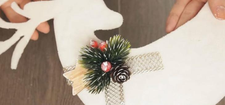 Перед тем, как закреплять новогоднего оленя на подставке, украсьте его декором по своему усмотрению: сделайте импровизированный шарфик из ленты, добавьте еловые ветки, шишки, ягоды, сверху нанесите «снег» сухой кистью с белой акриловой краской.