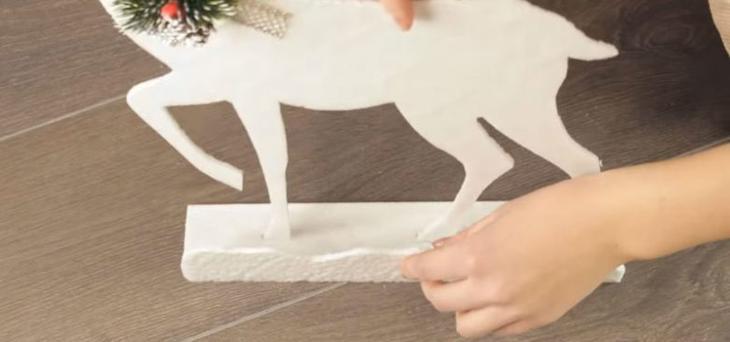 Перенесите шаблоны на потолочную плитку, вырежьте, края зашкурьте. Затем склейте две детали вместе — это подставка для оленя.