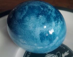 Яйцо получилось синего цвета с мраморными разводами. Но несколько светлее чем я ожидала. Пока я резала капусту у меня окрасилась доска и руки в фиолетовый цвет. Может яйцо с темной скорлупой выглядело бы лучше.