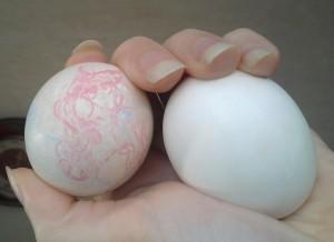 На яйце, завернутом в нитки, лучше всего отпечатались красные нитки. Голубой цвет слишком светлый, зеленого и розового не видно вовсе.