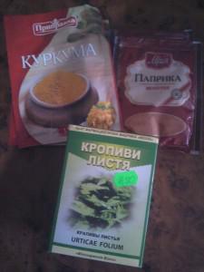 Я решила испробовать куркуму (окрашивает в желтый цвет), паприка (оранжевый), крапива (зелёный)