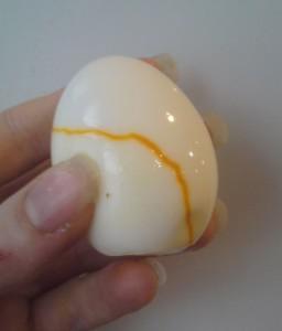 Кари дало золотисто-коричневый цвет. Нужно было брать белое яйцо, тогда цвет получился бы золотисто-оранжевый. При варке яйцо лопнуло, но не вытекло. После очистки на мест трещины осталась оранжевая полоска, думаю так примерно и будет выглядеть краситель на белой скорлупе.