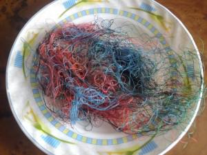 Понадобятся хлопчатобумажные нитки ярких цветов, желательно толстые. Можно так же использовать мулине, шерстяные, лоскуты ткани. Главное условие нитки должны быть старые -советских времен.