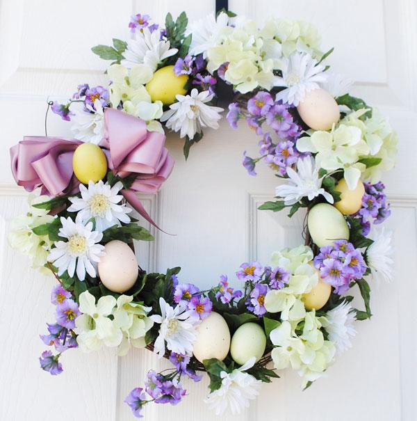 Думаю, что не ошибусь, если самым популярным предметом декора в этот праздник я назову пасхальный венок. Обычно его вешают на дверь или окно. Для создания подобных венков используются яйца, веточки деревьев и весенние цветы.