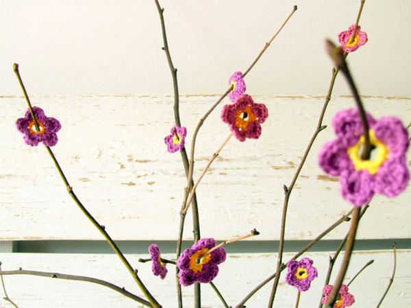 Если живых зеленых веток получить не удалось — не беда. Рукодельницы могут воспользоваться такой идеей: связать несколько ярких цветочков крючком и нанизать их на сухие прутики. Такой букет может выйти очень интересным, да и простоит подольше. К тому же, у вас останется комплект готовых цветочков к следующей весне