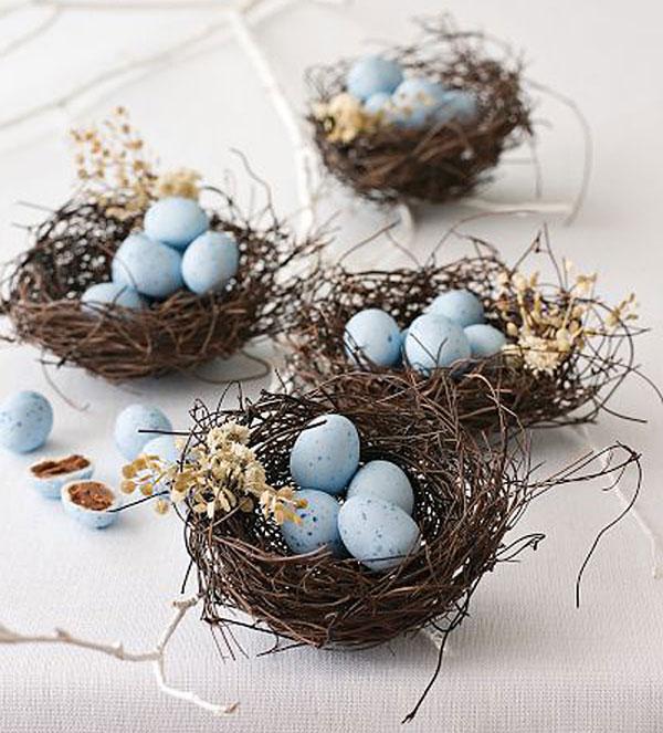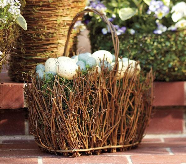 В пасхальном декоре активно используются натуральные природные материалы — прутики, кора, мох, сухая трава — из них плетут венки, корзинки и формируют подобие птичьих гнезд. Очень красиво на Пасху будут смотреться в доме распустившиеся ветки вербы и раннецветущих кустарников, о выгонке которых стоит позаботиться заранее.