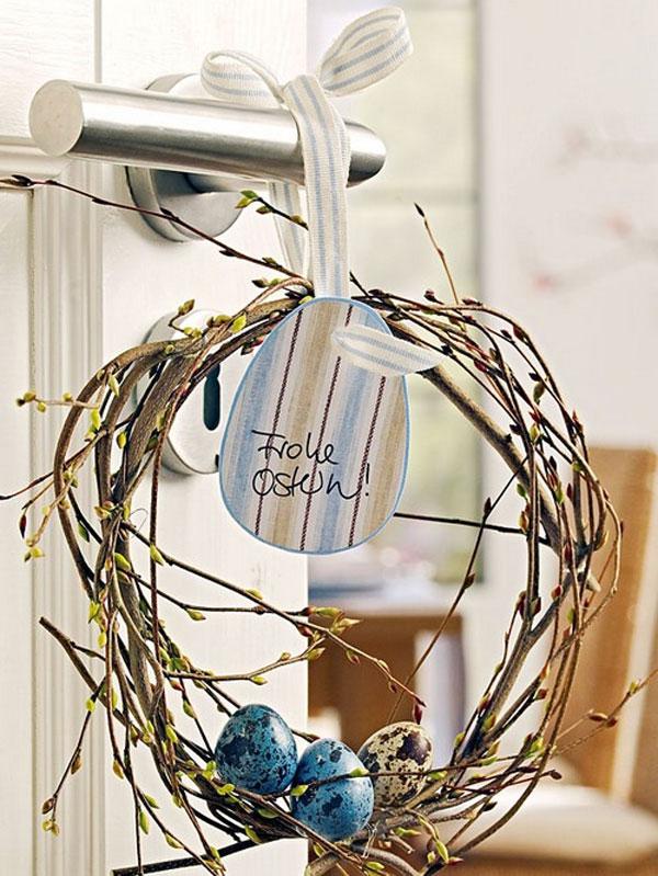 Свежо и оригинально будет смотреться венок из веток с набухшими почками, прикрепленный к дверной ручке или спинке стула. Сделать его совсем не сложно дома своими руками. Дополните украшение подкрашенными перепелиными яйцами.