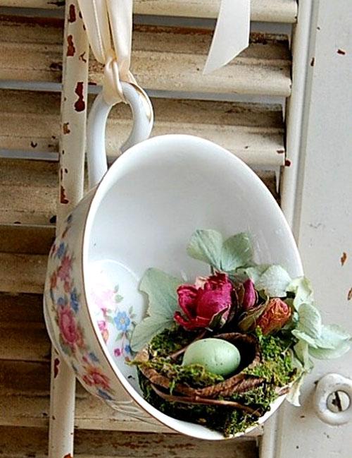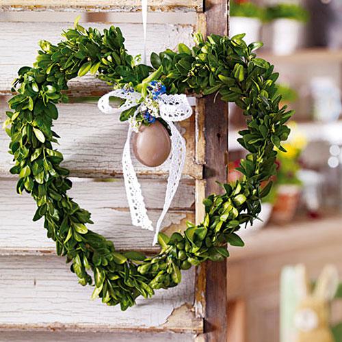 А вот еще несколько идей оформления спинки стула столового гарнитура: пасхальная композиция в фарфоровой чашке и венок в форме сердца из мирта. Кстати, такие украшения с успехом подойдут и длядекора стен.