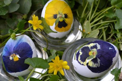 Но идея с Анютиными глазками не давала мне покоя )))) Это тоже декупаж, только цветочный. Мне кажется Анютины глазки (не люблю называть их Виолой) самые не обычные весенние цветы. Цветочки и листики пару дней подержала под пресом, как в дестве листики для гербария. Остальное как обычно яичная скорлупа, акриловая краска и клей для декупажа.