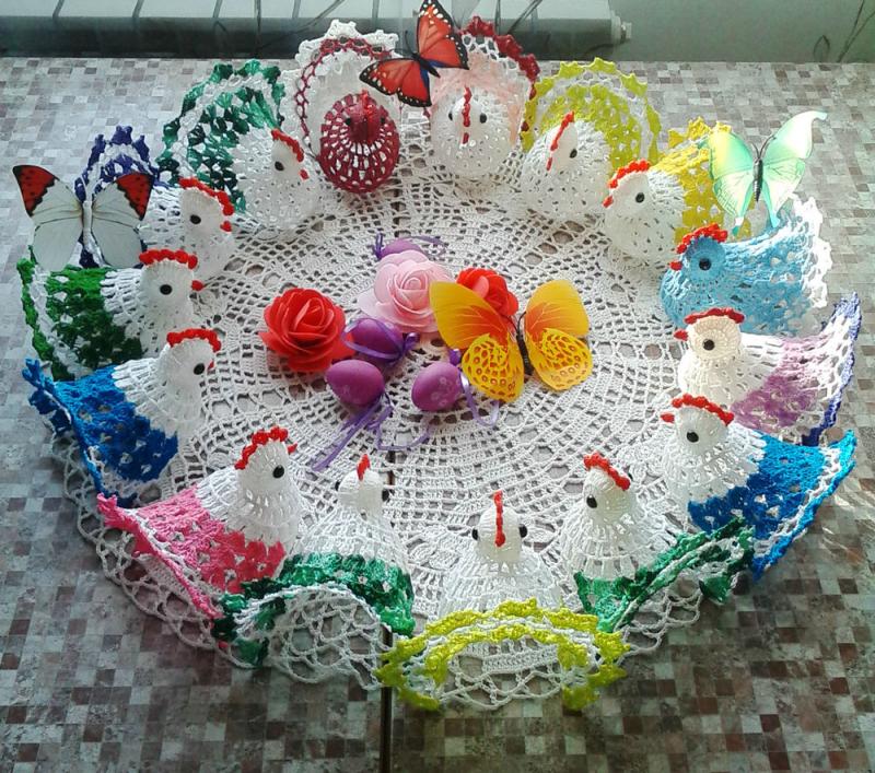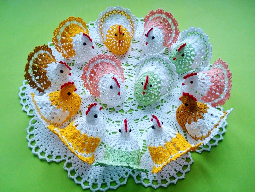 Особо нежно и прозрачно такие курочки выглядят из белых хлопчатобумажных ниток, они словно сделаны из ажура.