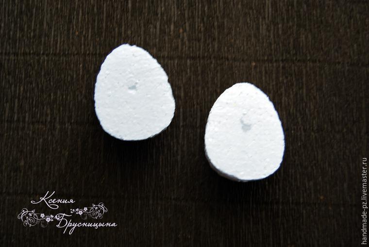 Для начала разрежем пенопластовое яйцо на две части. Лучше это делать с помощью горячей струны, для получения как можно более гладкого среза.
