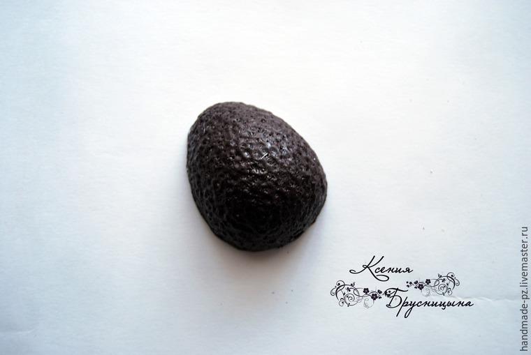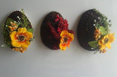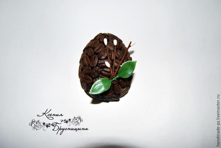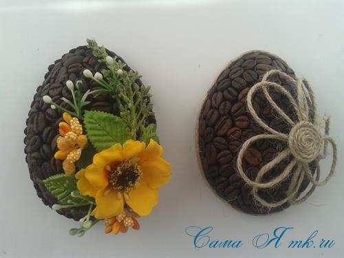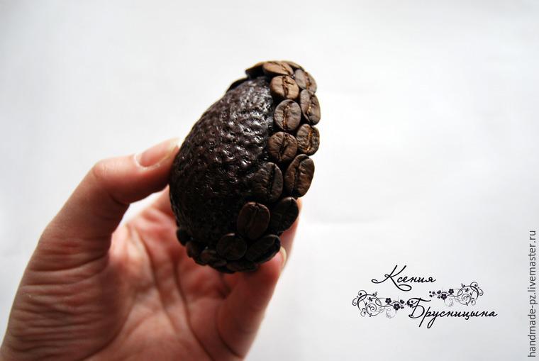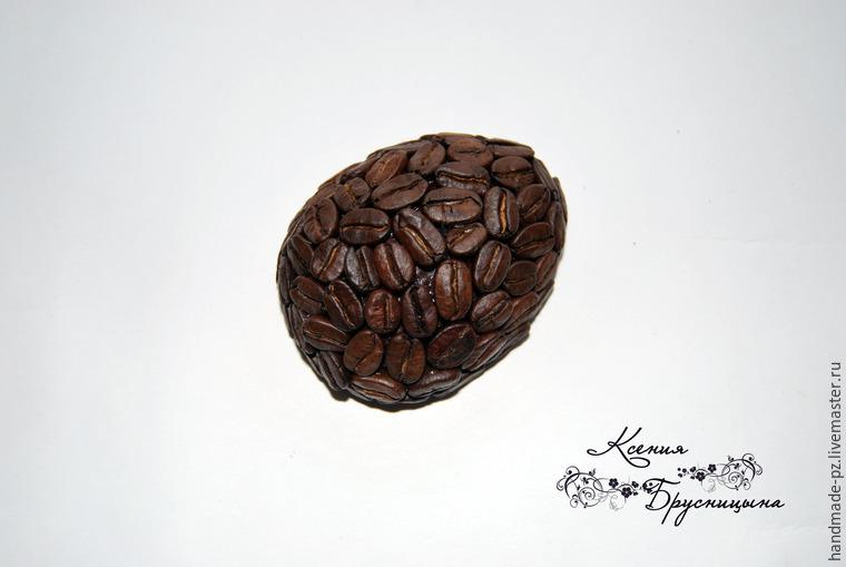 Начинаем обклеивать яйцо кофейными зернами, по кругу. Клеим как можно плотнее, чтобы не оставалось промежутков между зернами.