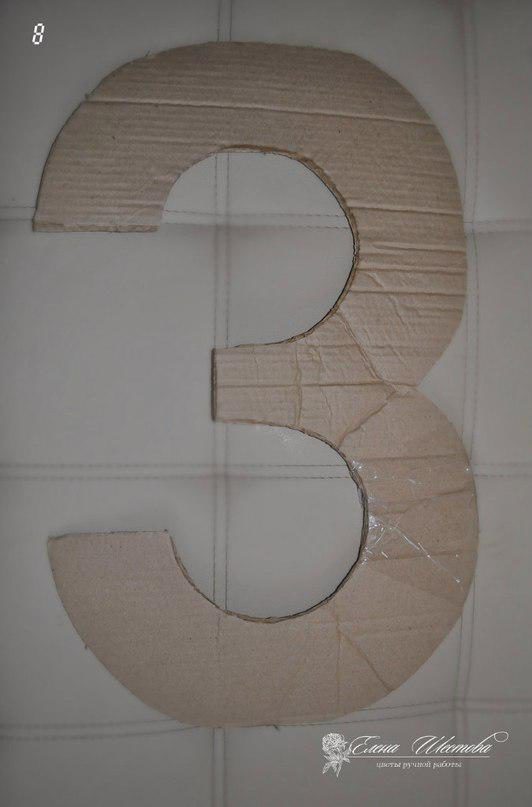 Из гофрокартона вырезаем каркас цифры нужного размера. Для прочности конструкции, я делала два слоя картона.