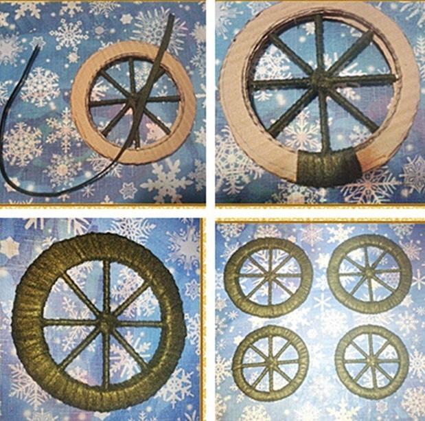 Нитью или бечевкой оборачивают каркас, чтобы скрыть места соединения и придать колесам эстетичный внешний вид.